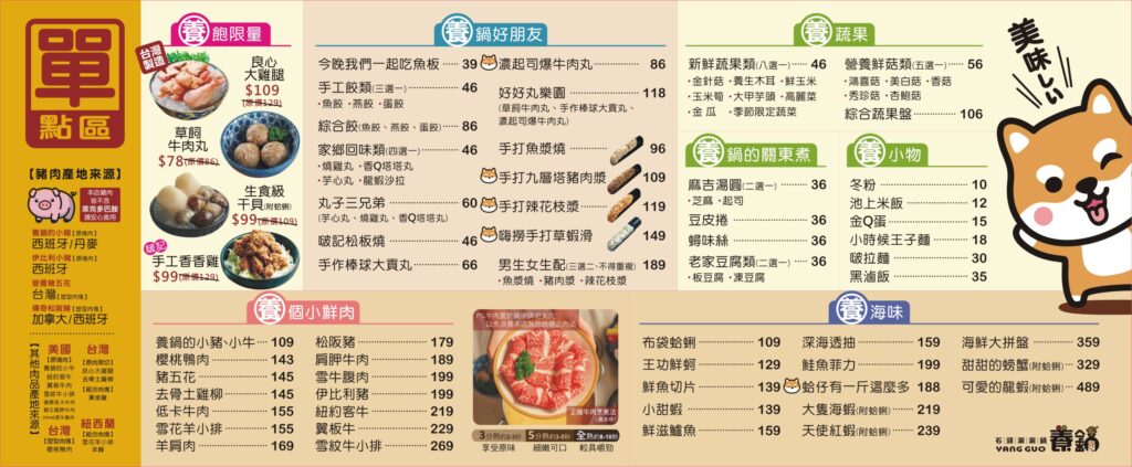養鍋沒有特製的寵物餐點,就是開寵物清水鍋,其餘肉品和蔬菜都是人類菜單上點的,如果有特定哪盤是要跟狗狗分享的,記得要跟店員說不要加任何調味料,因為有時候雞腿上或是肉片上會灑一些裝飾調味用的粉末。