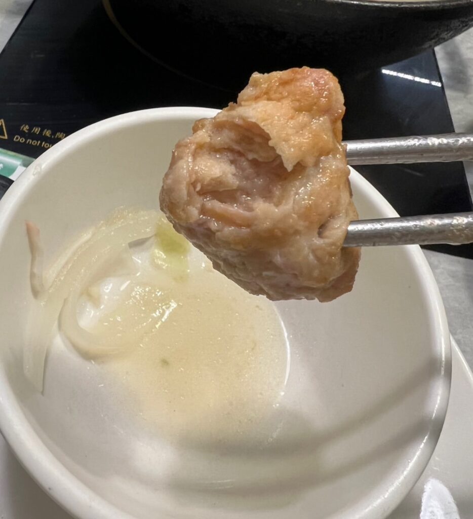 我是個滿不喜歡吃丸子類的人,一上桌通常都丟給隔壁鍋的盧爸,但菜盤裡有顆養鍋的燒雞丸我超喜歡的XD雖然拍的很普,但是裏頭紮實的餡料是我心中的美味泉源~~