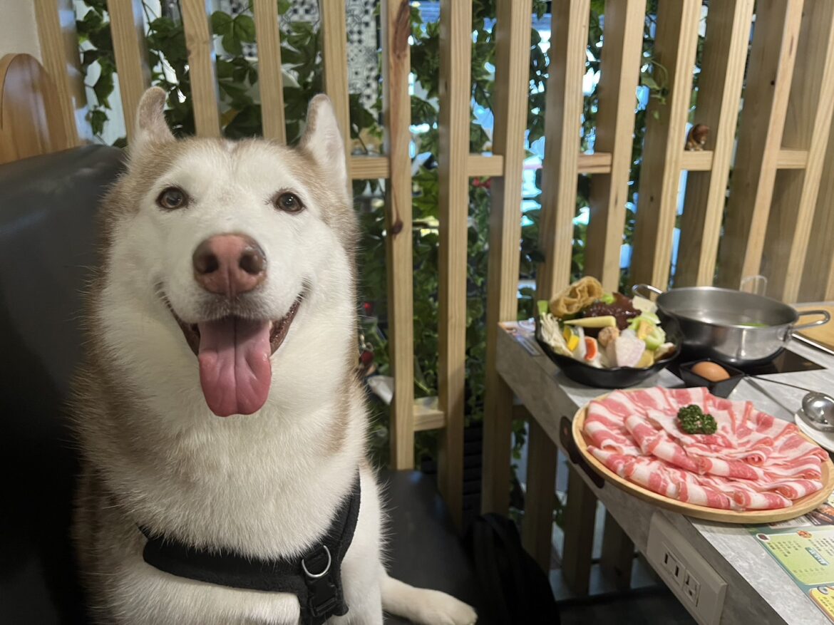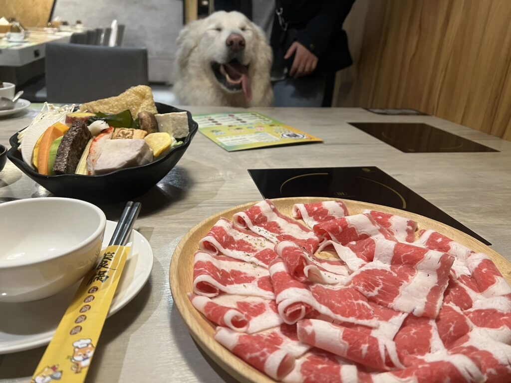 如果有帶寵物,店家通常會問需不需要開清水鍋,我都會說要,客人多的時候,分配到的兩個電磁爐上就會有三個鍋,我會先把盧娜的煮好再換自己的鍋。切記給狗狗吃鍋,千萬不要用人類的湯底喔,我們無法保證店家有沒有添加洋蔥或一些對狗狗來說有毒的食材熬煮湯頭,太鹹也會造成狗狗負擔,萬萬不可。