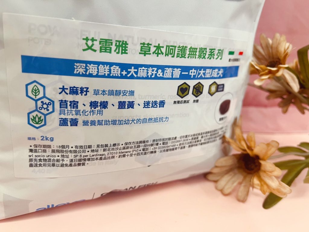 一般市售常看到的飼料都是雞肉、羊肉、魚類等等,再更罕見一點就是鹿肉、袋鼠肉,然後搭配一些蔬果營養元素,不過我第一次在艾雷雅看到深海鮮魚+大麻籽&蘆薈口味,是市面上很少看到的草本健康寵糧,尤其大麻籽跟蘆薈真的少見。