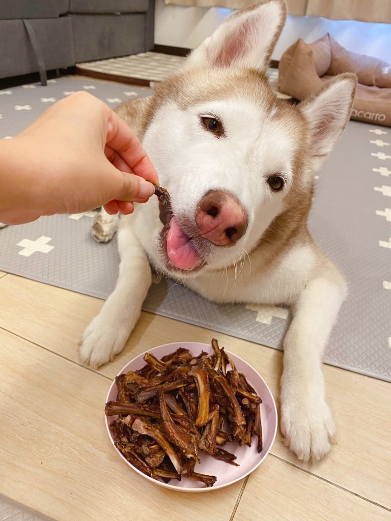 盧娜吃烘鵪鶉的口感就是嘎崩脆,她23公斤 一片鵪鶉乾約10分鐘完食,提醒無論任何零食,只要狗狗第一次嘗試,都建議在旁邊觀察,避免吞太快或是沒有咬食的風險,小型狗跟大型狗吃的速度跟重量也不一樣,盧娜一天一隻沒有問題,但小型犬或胃口比較小的狗狗可能就要折半,或是吃到一半先收起來。