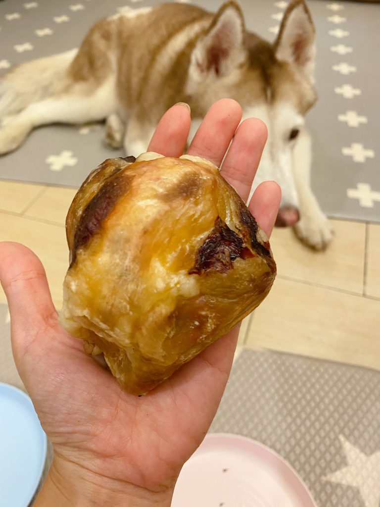 烘乾的牛骨輪,外表沒有太多肉屑,主要是有牛筋和軟骨包覆,裏頭則是貨真價實拳頭硬的骨頭,這主要讓狗狗磨牙用,盧娜每次吃完後排牙齒的牙結石都會脫落一些,天然的潔牙效果我覺得超讚,但是我們有隻哈士奇朋友,因為沒有注意,就整顆讓狗狗吃掉了,後來便祕了一個禮拜,所以吃的時候請一定要小心,15~20分鐘就可以準備收起來了,可以稍微水沖一下冰起來下次再吃,盧娜的話因為咬合力較小,所以沒有發生過整顆吞食的狀況,那兩天就會像玩具一樣,她想咬就去啃一下,打發時間、消耗體力的效果挺讚的!