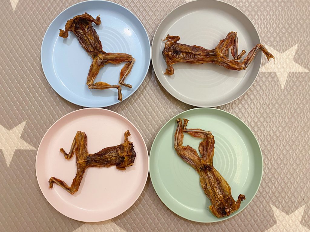 在市面上其實常見都是雞肉乾、牛肉捲之類的零食,鵪鶉、青蛙、豬天梯等等,製作相較麻煩因此也比較少見,不過抱著給盧娜偶爾打野味的感覺,希望讓她身為一隻狗狗能有些野外食物的滿足感~~~(雖然不是自己狩獵的XD)
