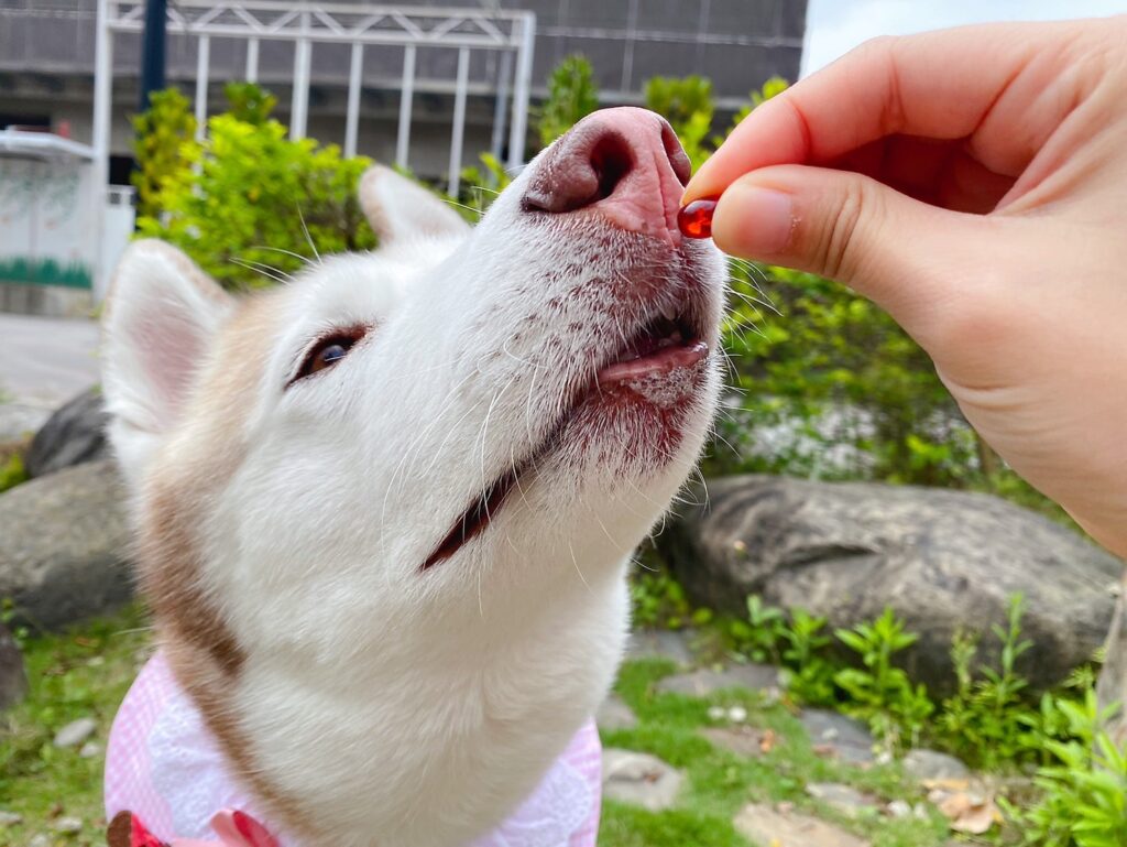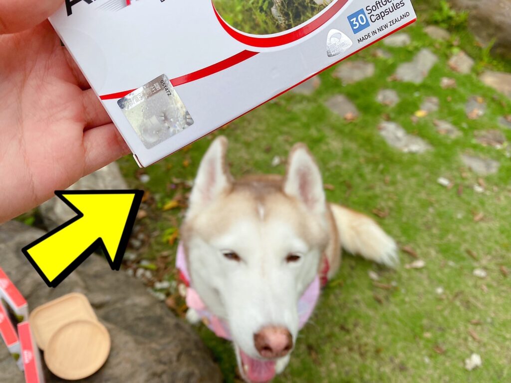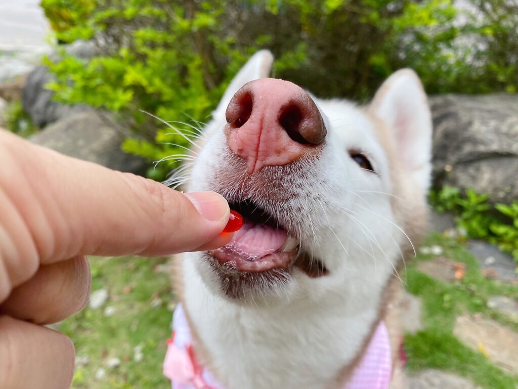 盧娜的體型,說明建議是前兩週先吃四顆,接下來吃兩顆就可以了,放在她的飼料裡盧娜就會主動吃掉了,不會挑食,如果狗狗比較挑食,可以放在肉肉裡,或是把外層塗上適口性高的營養膏、或是一口安適得搭配零食,總之盧娜從第一次服用上就沒遇到什麼困難,她第一顆玩很久,咬破之後我覺得是濃濃的蝦子味,她很喜歡,後面一口氣就連續又吃了三顆。