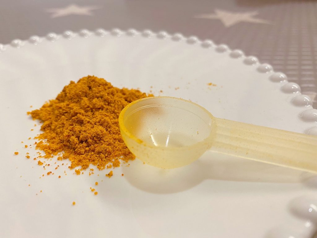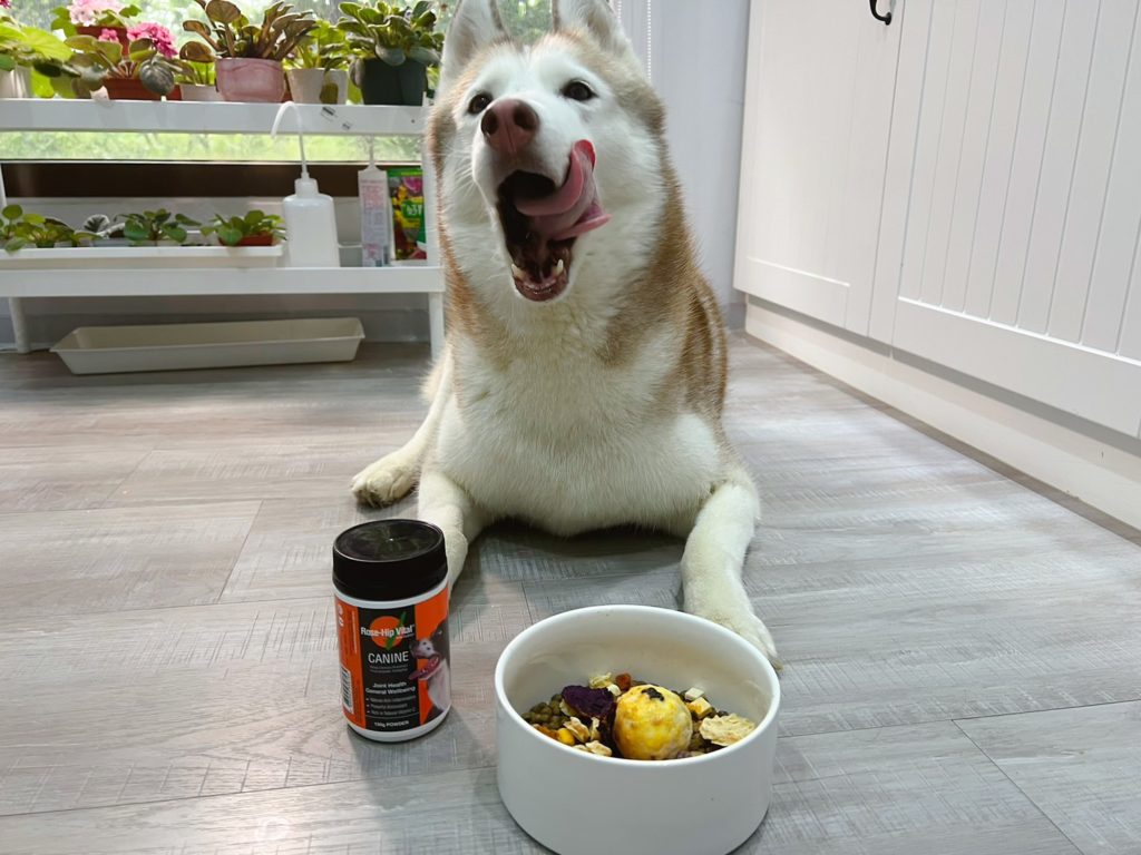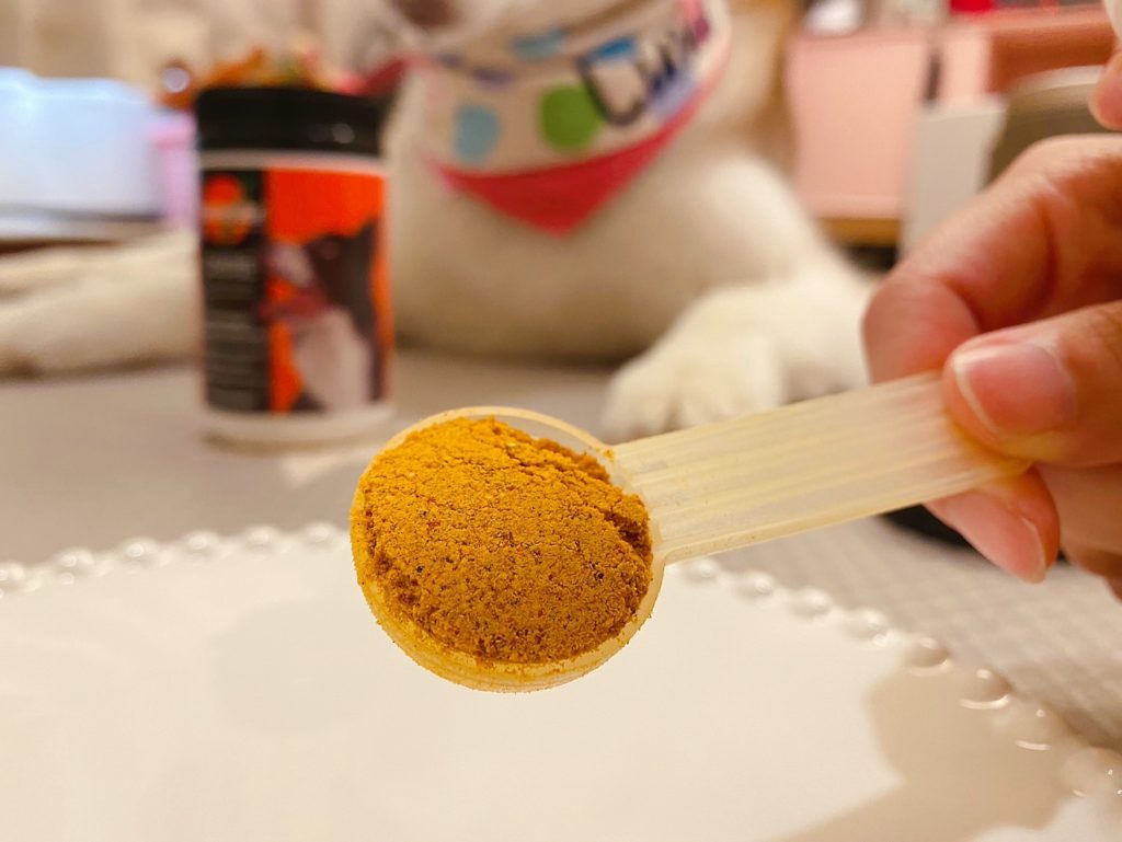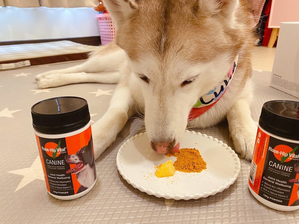 呈現自然薑黃色的玫瑰果粉,盧娜以前完全沒有嘗試過,基於哈士奇的玻璃敏感腸胃,我頭一開始並沒有按照說明直接給予四匙,以往經驗她的腸胃耐受性不足,一次吃到四匙,她鐵定吐給我看、不然就拉給我看,所以有腸胃敏感病史的狗狗也建議無論何種保健品,都慢慢增加劑量讓腸胃有多一點適應的時間會比較好哦~