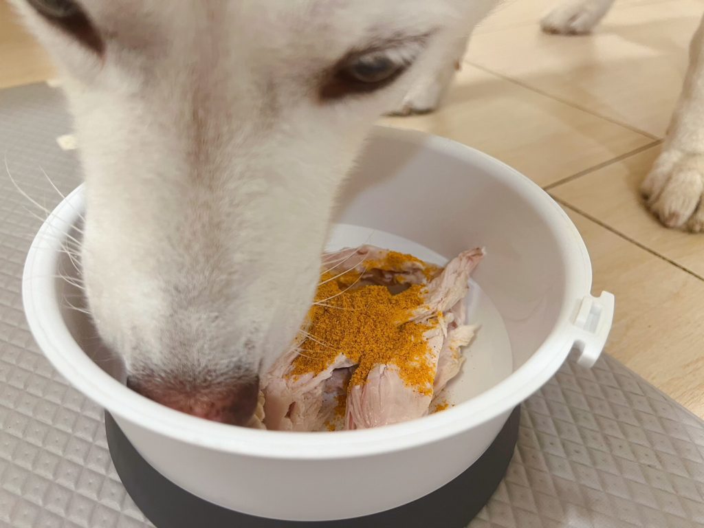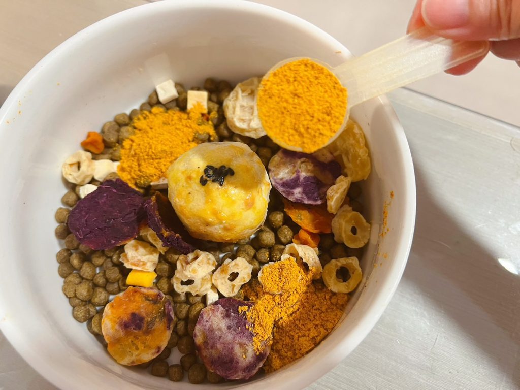 後來我就把粉加入了她平常吃的飼料裡,適逢中秋節還配了顆雞肉蛋黃酥,異常有情調XD