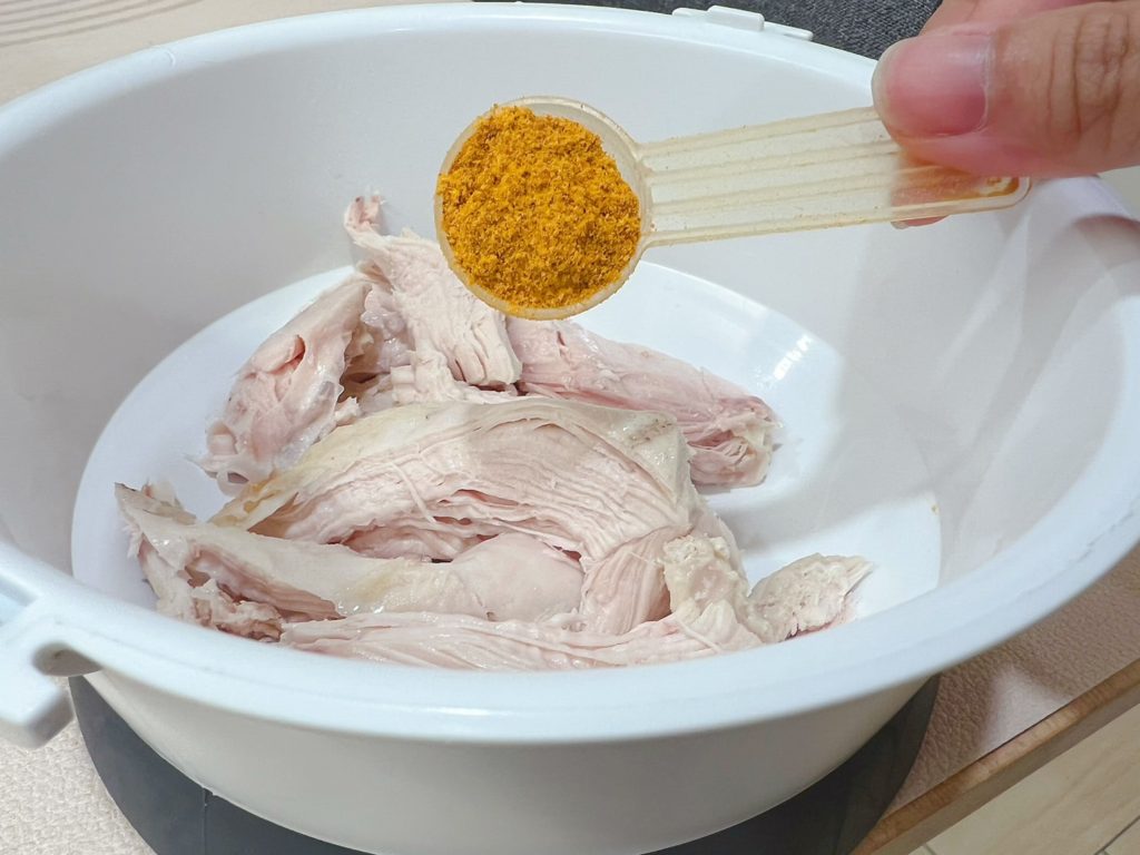 第一次吃,我先加在了水煮雞胸肉裏頭,記得這款保健品要特別注意的地方,就是不能加熱或是混入熱食或熱水中,所以我的雞胸肉是蒸熟放涼以後才加粉哦!