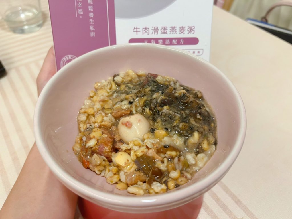 牛肉滑蛋燕麥粥(熟齡關節保健食療配方),想要盧娜跟早餐拍張合照,但她已經受不了了XD這款盧娜也是超愛的口味唷。