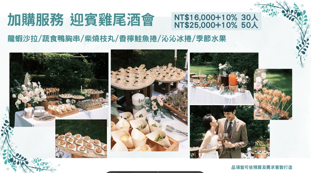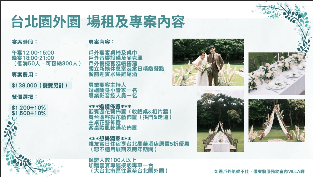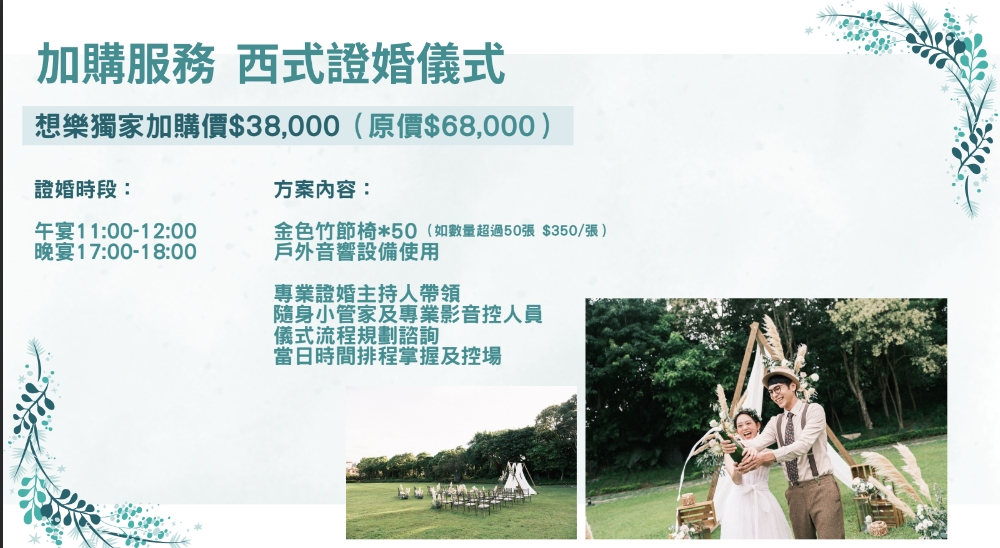 臉書推廣告的時候,才得知除了勾勾婚禮外,想樂工作室也是有美式派對風格的婚禮服務規劃,包括婚禮顧問、 婚禮統籌、活動策劃等等,當然我又是先被草地陽光的美式婚禮吸引了~所以詢價了台北園外園,同樣是官方2023提供新人的價格,一切異動以官方為主。