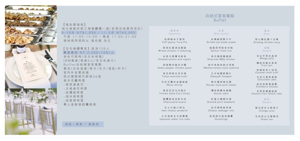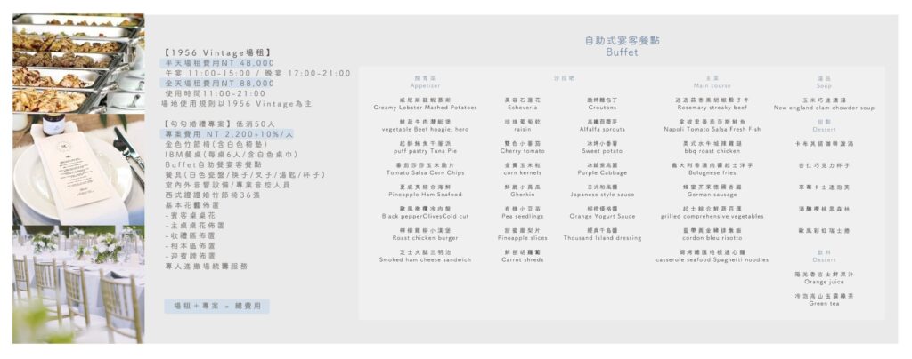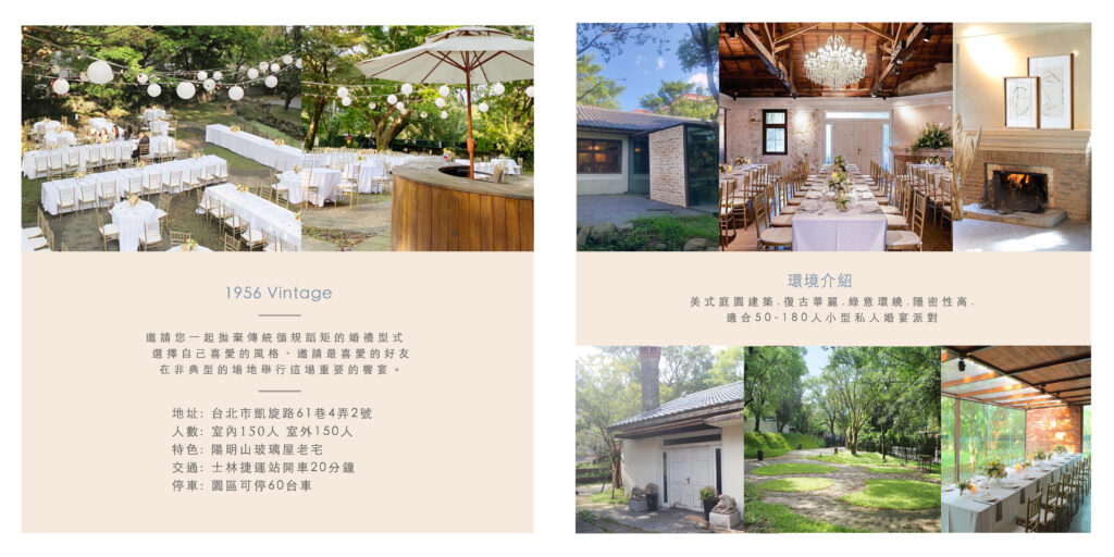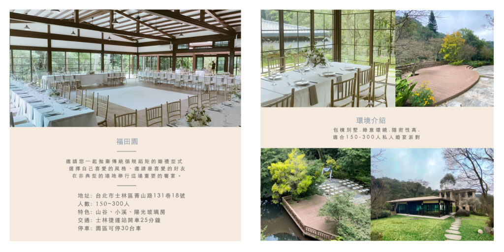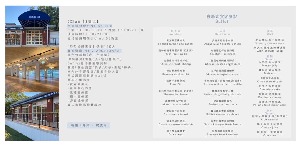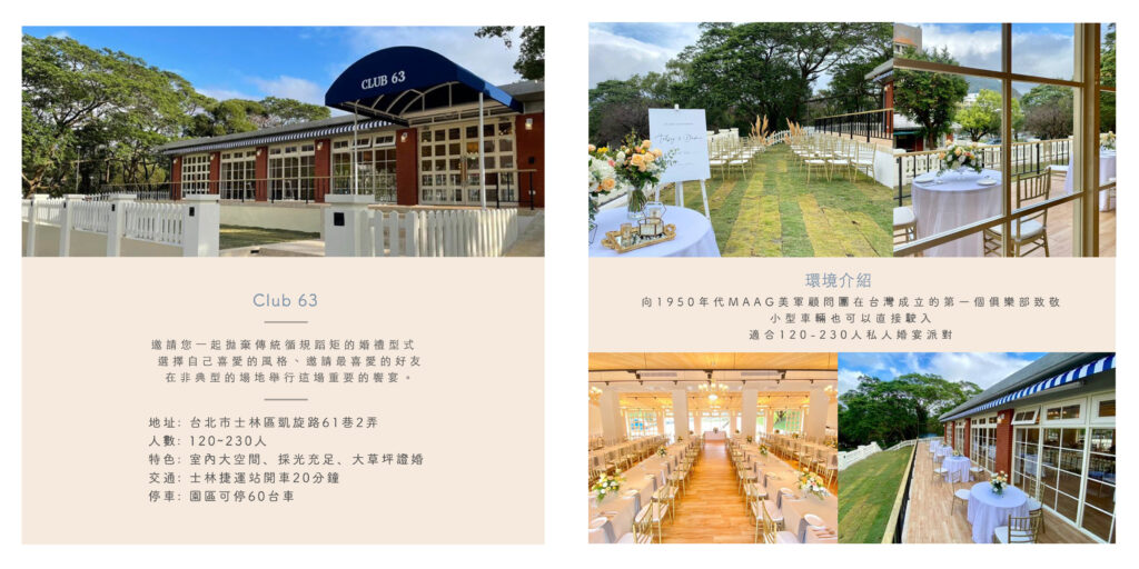 因為一剛開始我幻想的婚禮是大片草地,陽光灑落在狗狗們身上的畫面,所以我幾乎北台灣類似的場景都查過一遍,包括”勾勾婚禮”婚顧,有在規劃的婚宴場地,Club63、1956vintage、福田園、美軍俱樂部等等,都符合我的想像。但就跟前段說的一樣,礙於親友都必須驅車前往,實在太累,加上要預訂半年後甚至一年後的好日子,室外天氣因素無法掌握,所以決定放棄。以下是我2023年所詢問到的價格僅供參考,一切依照官方異動為主。