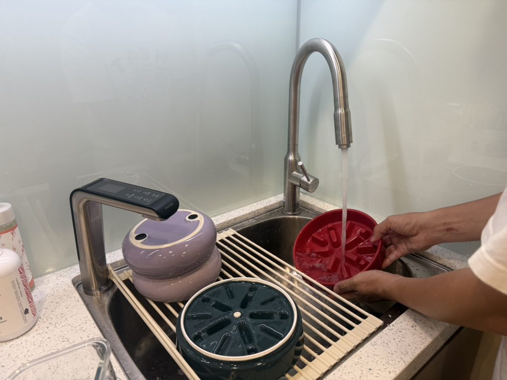 切到電漿水模式後,水柱沖一陣子就覺得乾淨感回來,比只用一般水沖省力許多,對每天都在追著狗碗洗的我來說,真的明顯有感,我也有問盧爸他感覺有差嗎?他說還沒特別感覺,後來討論出來,因為狗碗一直以來都是我在洗!!!!拍照這天是因為我需要拍照才請他當手模,所以他是第一次,當然無法比較(白眼翻上天