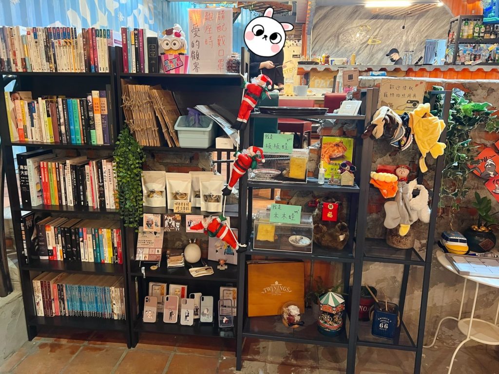 書櫃上面就是上面一層,廚房、結帳區、化妝室,還有HAPPY的運輸籠都在這裡。 書櫃上有很多種書還有各種狗狗拍照的道具可以借用,就算自己一個人也可以消磨很多時間~