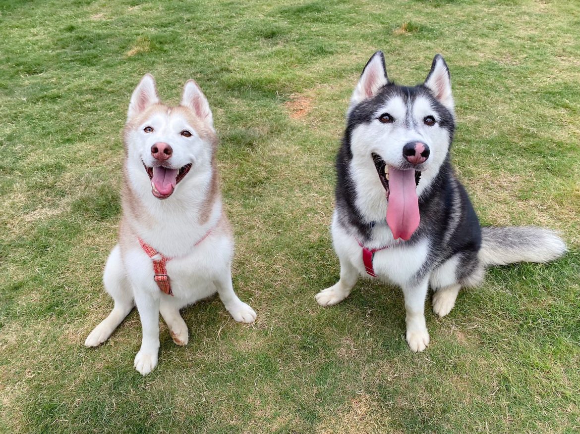 草坪大小是足夠讓哈士奇奔跑的,玩累了他們會結伴回來喝水。