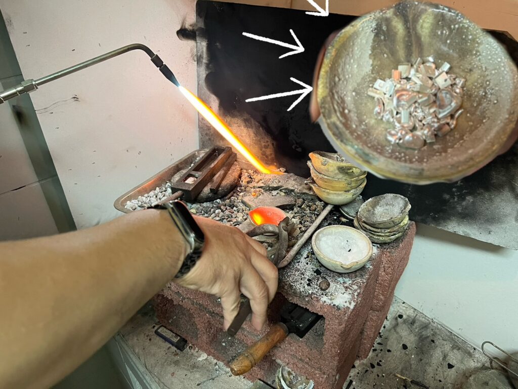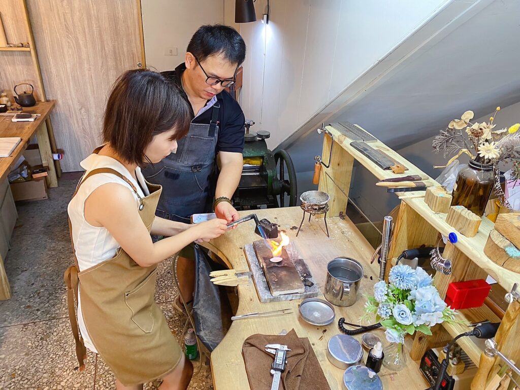 在預約時間抵達後,老師很快就進入正題,右上角的小盤純銀粒,先用高溫經過融化,倒入鐵盤變成一塊銀塊,每個步驟老師都有跟我說原理,讓整個過程很親近,像這樣拿瓦斯槍的專業手法,老師也會協助,我是在旁邊看而已XD很安全。
