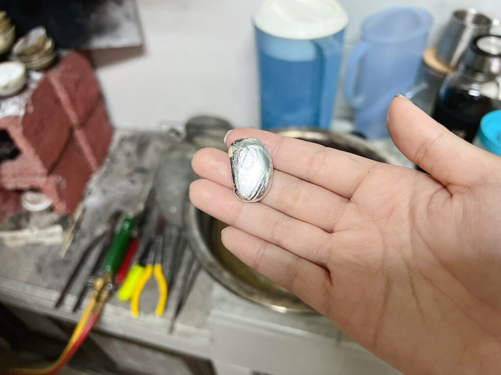 要怎麼確定是純銀,可以透過火焰反射的紅色焰光來確認,如果是其他顏色的火光那可能就不是純銀了!另外純銀有接近千度的熔點,導熱很快,在上手工藝課的同時也很像上物理課,不用擔心跟第一次見面的老師氣氛尷尬,因為光是動手做和聽這些小技巧就很緊湊了,時間會覺得過很快!下方照片是燒出來的純銀塊