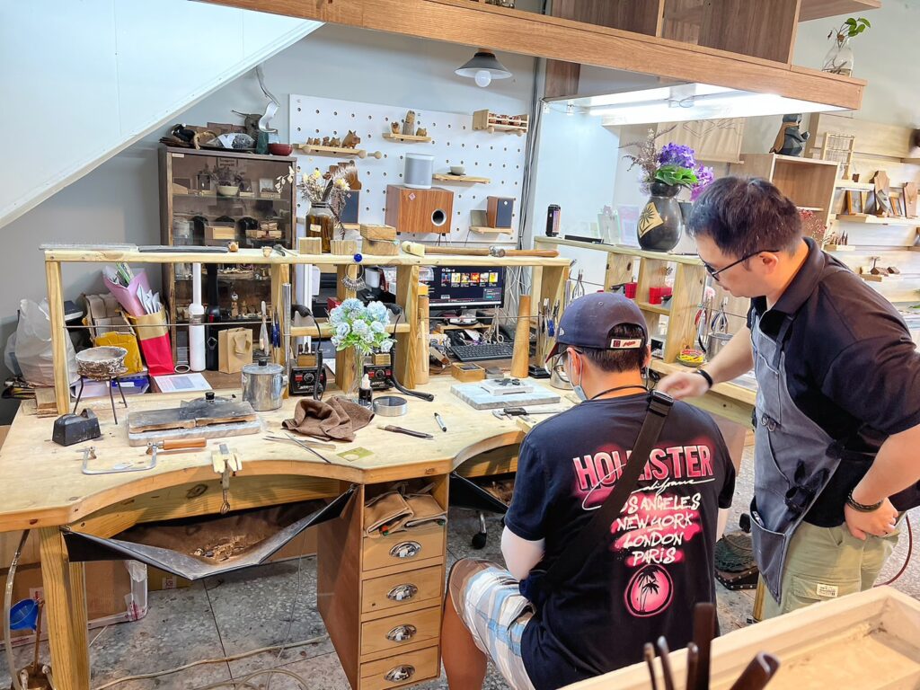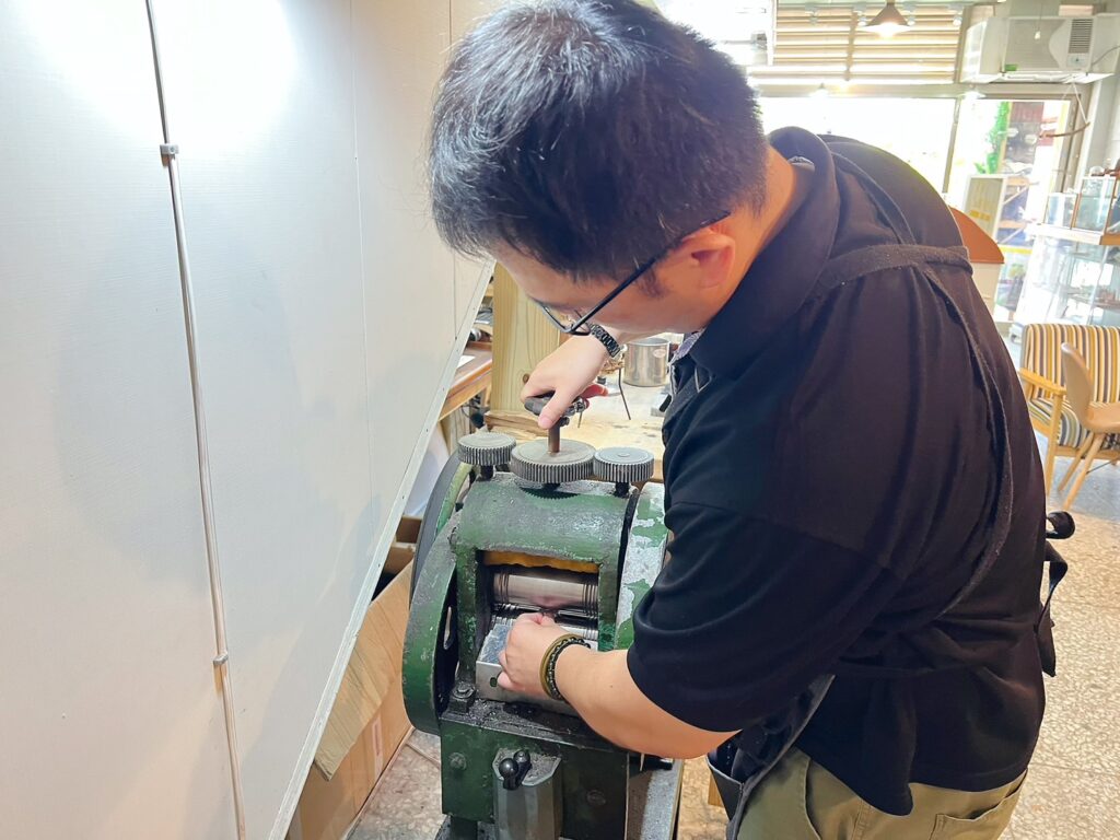 接下來就整理銀片,用鐵鎚敲敲打打整平,還有送到輾壓機壓得更加均勻,老師會先示範一兩次給我看,然後接著換手交給我來做,很多機器都是第一次操作,很有趣!