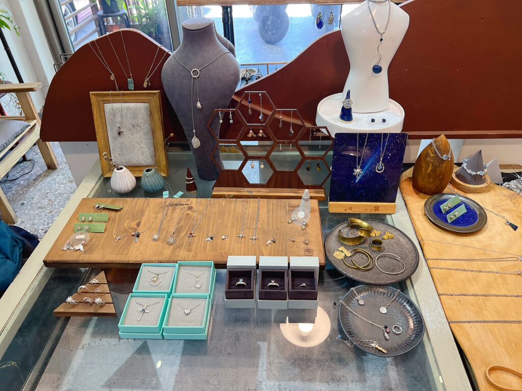 後山金工房隱身在花蓮吉安鄉的民宅巷弄內,跟著導航很好尋找,店內屬於體驗教學專門店,訂製商品為大宗,所以就算沒有學生的時候,老師們看起來也是挺忙的,店內無論項鍊、耳環、手飾都好有特色和故事,戒指的款式,也比我查過的多家金工房資料,多了很多種。