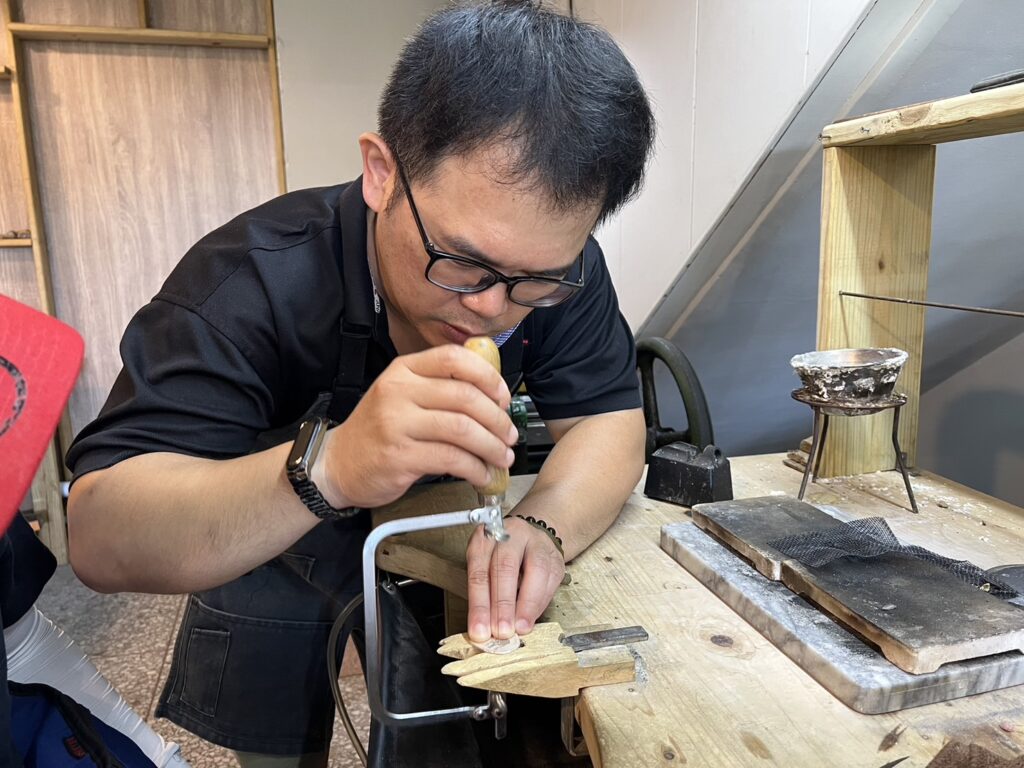這個步驟我覺得算是全部過程裡面最困難也最需要有耐心的了,因為銀片邊緣關係到狗狗圖案的形狀,話說回來,文章還是無法把每一個步驟都詳細介紹啦,包括用到鼓風爐、使用到硼砂之類的,還是要自己預約課程來玩,最能感受手作的快樂~