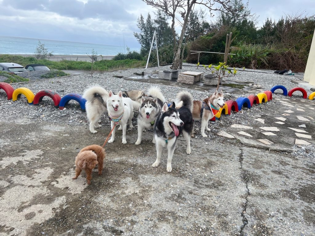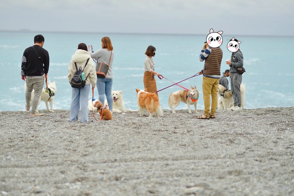 然後吃完順著店裡的下坡走,大概一百公尺就可以直接踩進海灘,這是康樂海灘,人比七星潭少了超多,一大片美麗的海讓我覺得來魚刺人真的超級值回票價,我們一起在這裡廝混了一陣子,狗狗們都很開心也放鬆。