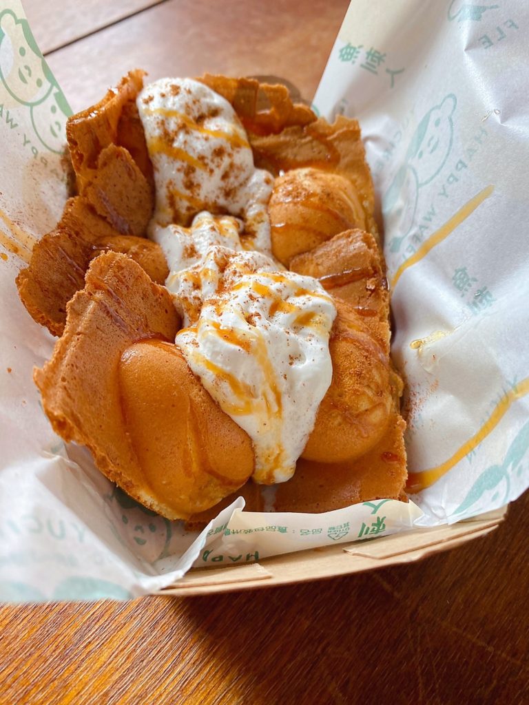 這是曾水港紅豆麻糬蛋糕,我拿朋友的來吃,內餡毫不保留就是紅豆跟麻糬。而我點的焦糖蘋果,內餡也有蘋果顆粒,吃起來滿驚豔的,雞蛋糕能夠做出這麼多變化真的好可愛。