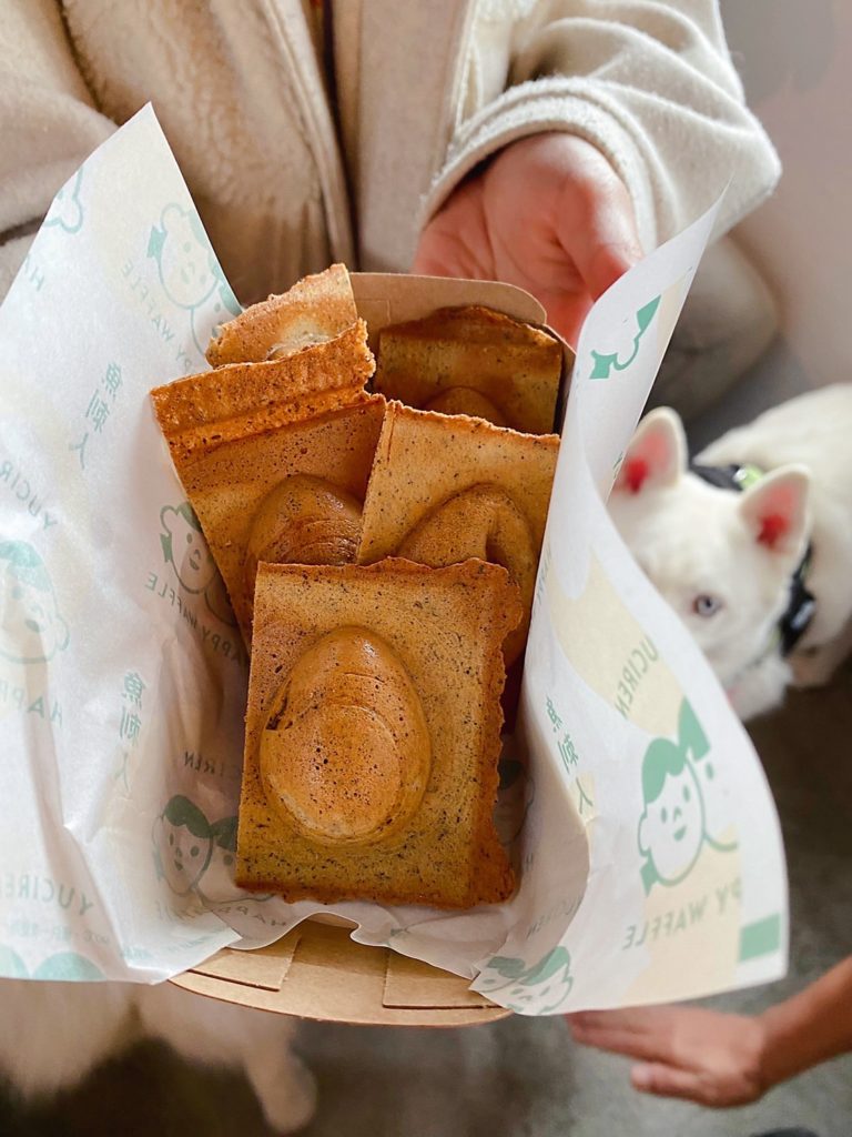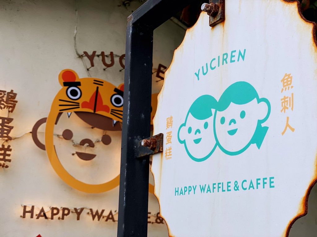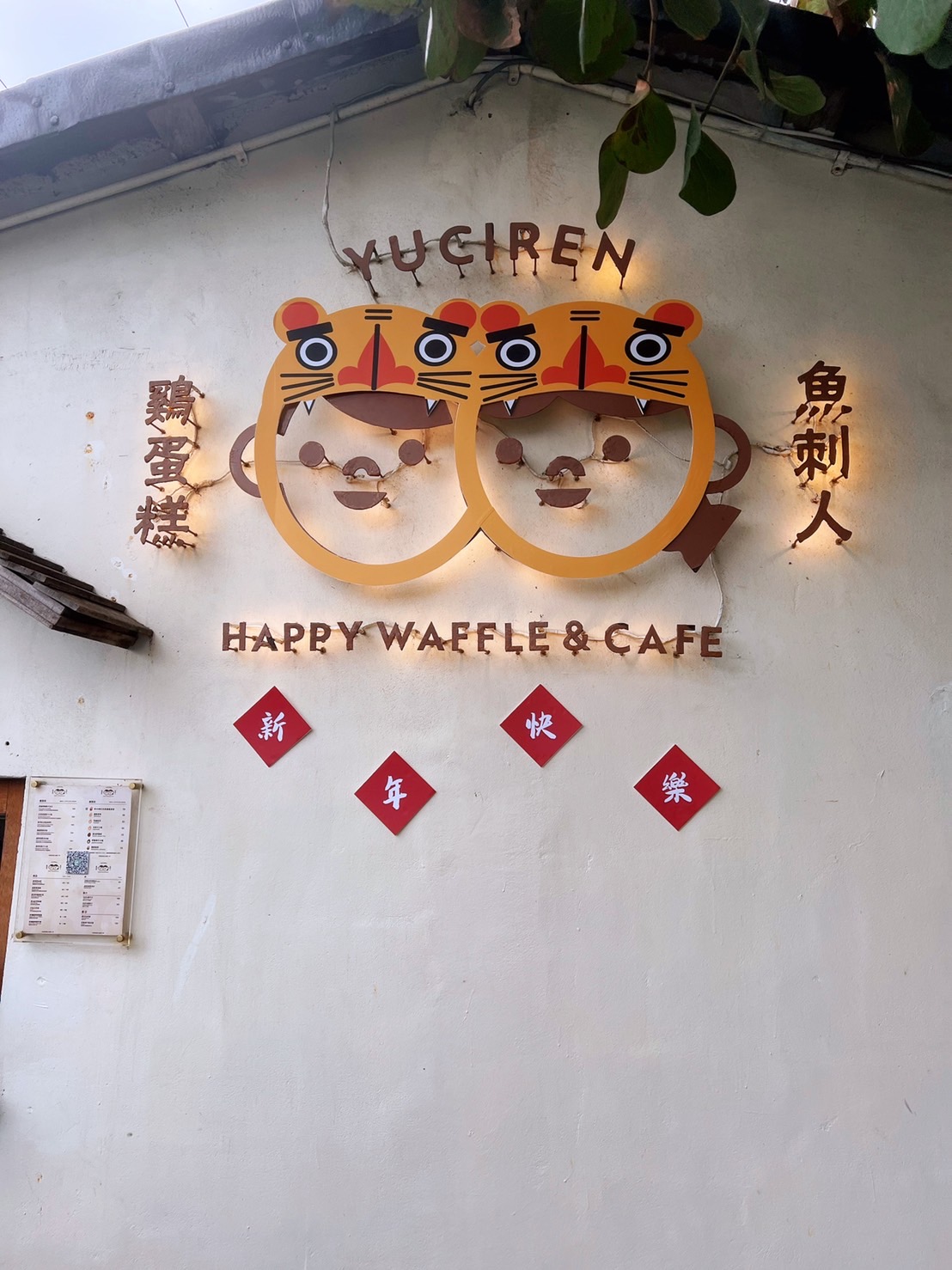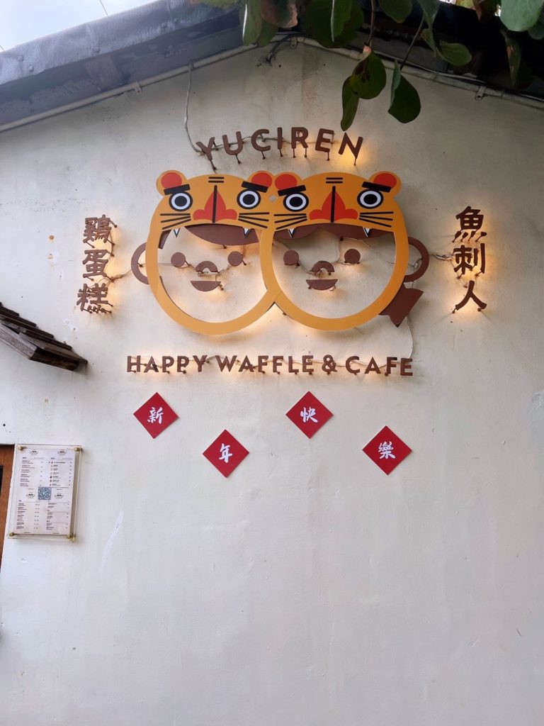 店門口的魚刺人娃娃真的好可愛,這是以兩個創辦人去做的大頭娃娃,而且竟然還配合虎年造型戴了兩個頭套,每個觀光客幾乎都拿著飲料或雞蛋糕合拍,但除非小型犬,不然要把狗狗抱到這塊招牌的高度拍照會有點難度XD