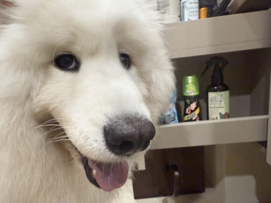 跟一張花絮照,「你說的白是什麼白?」我家薩摩耶的白,就是要乾乾淨淨的啦, 哈哈哈哈哈