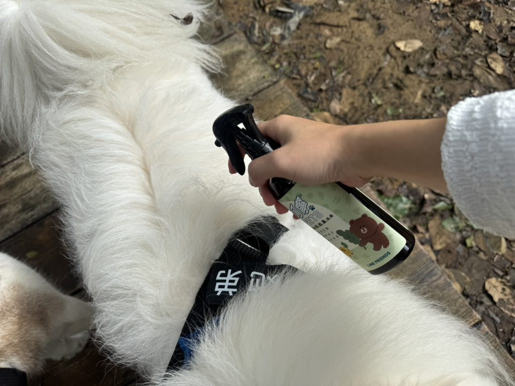 如果要去一些山邊或是草叢比較多的地方,就會讓兩隻小狗先噴一噴,這也是一種儀式感了,只要噴到叮寧就知道今天要出門玩囉!雪球開心的心情藏不住,抽屜開起來,已經乖乖在等噴噴霧了!