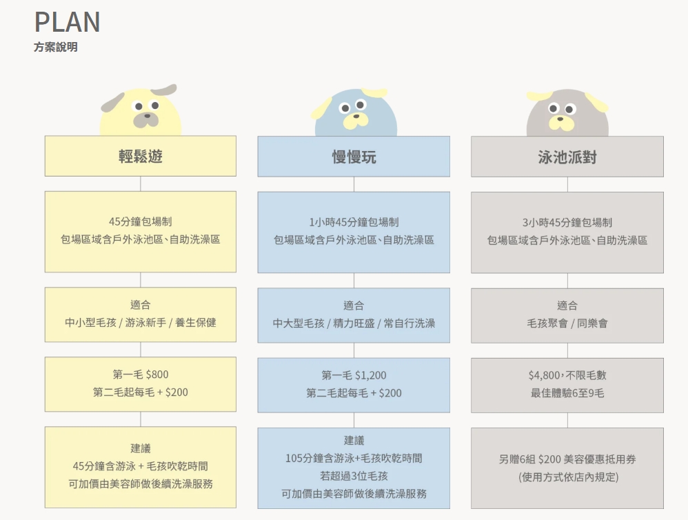 附上方案費用提供參考,我們選的是45分鐘輕鬆游,800元。這45分鐘是包含游泳和自助洗的時間!!所以我們用美容師加價的服務,這樣就可以暢遊45分鐘後再直接接續洗澡,否則哈士奇要自助洗,光是吹毛都不夠45分鐘了吧XDDDD