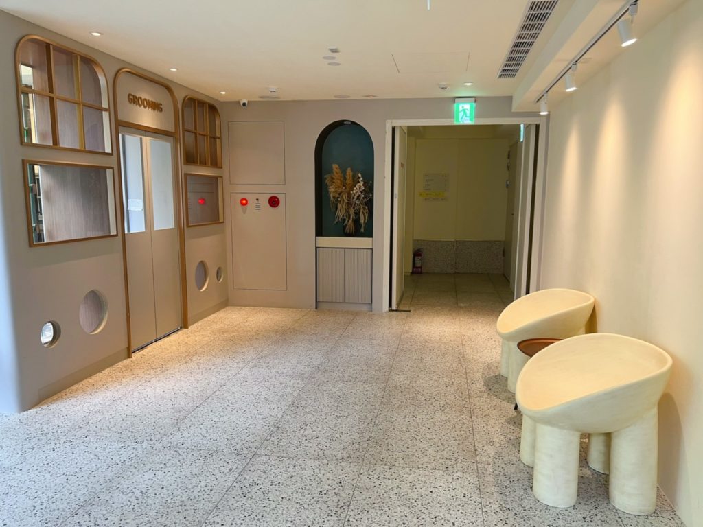 電梯搭到B1,一走進公共區域,右手邊是寵物美容間,通關的門卡感應一下,就可進入泳池區。單一動線規劃。