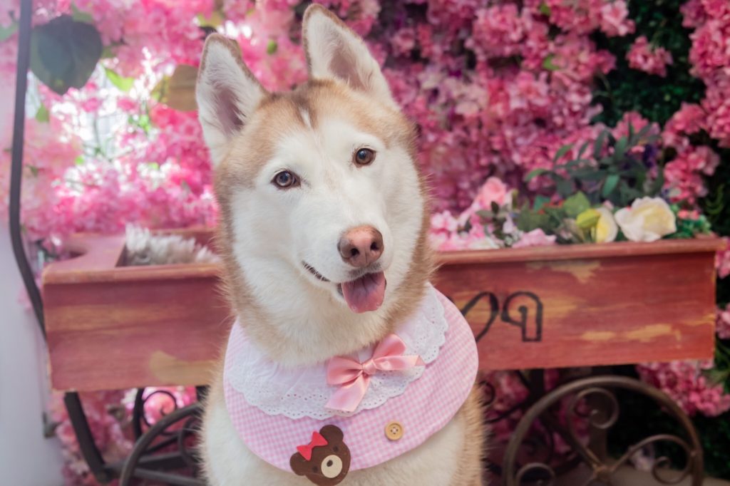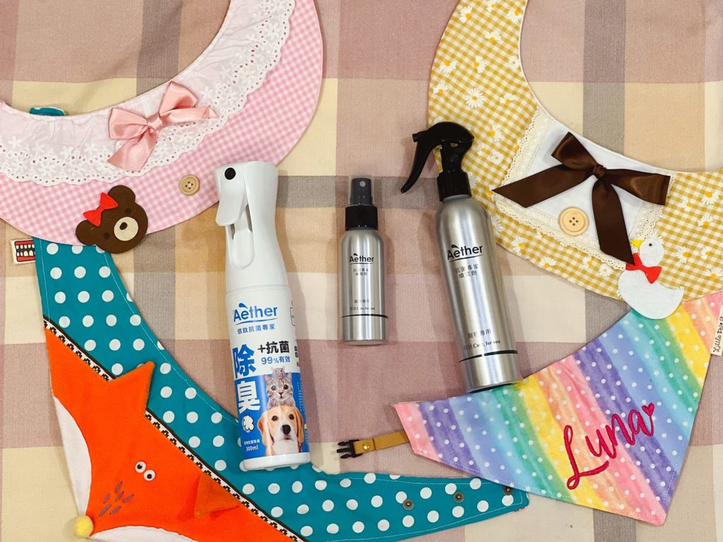 你看光是一條粉紅色領巾,上頭就有熊熊、鈕扣、蝴蝶結、蕾絲,狗狗的領巾都很精緻、小配件也很多,其實常常清洗也是一件很耗損的事情,用噴霧除臭抗菌反而能夠延長領巾的壽命。