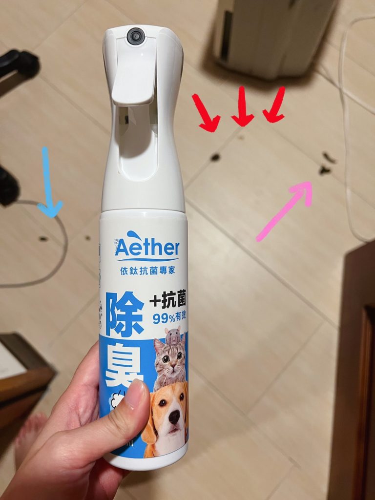 雖然照片裡,箭頭的地方都是碰碰的便便,但還好,真的還好,我撿完便便,還有Aether依鈦抗菌專家可以救我,原本超級臭的便便味道,在我噴完噴霧後,突然就一掃而空,像是世界大戰前沒發生過任何事情一樣,就連本來滲進尿液的磁磚,我都多噴了幾下,下班回來進房間,一點殘餘的臭味都沒有,效果很驚人。